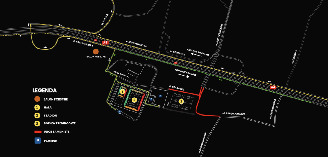 Wskazówka: Wpisz w mapach „Arena Katowice, Nowa Bukowa 1” – to doprowadzi Cię bezpośrednio do wejścia.