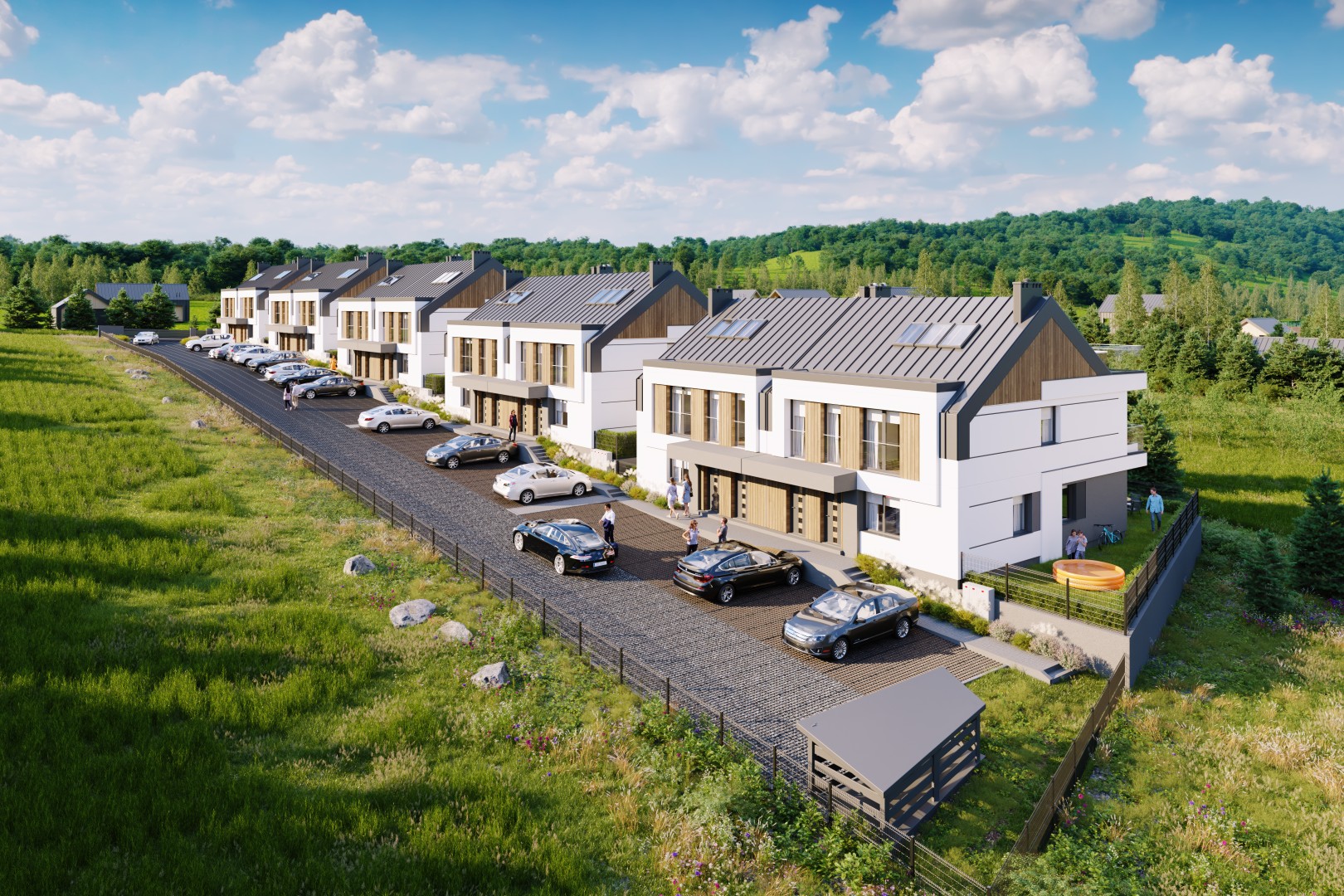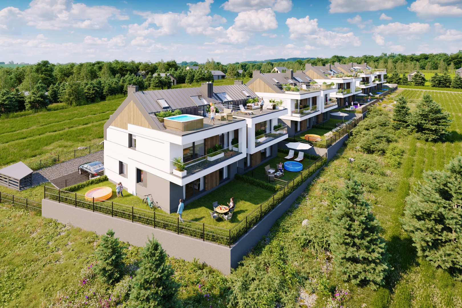 Projekt obejmuje 10 budynków, w każdym zaprojektowano dwa apartamenty – łącznie 20 lokali. Niewielka skala zabudowy zapewnia prywatność, komfort i estetyczną, uporządkowaną przestrzeń.